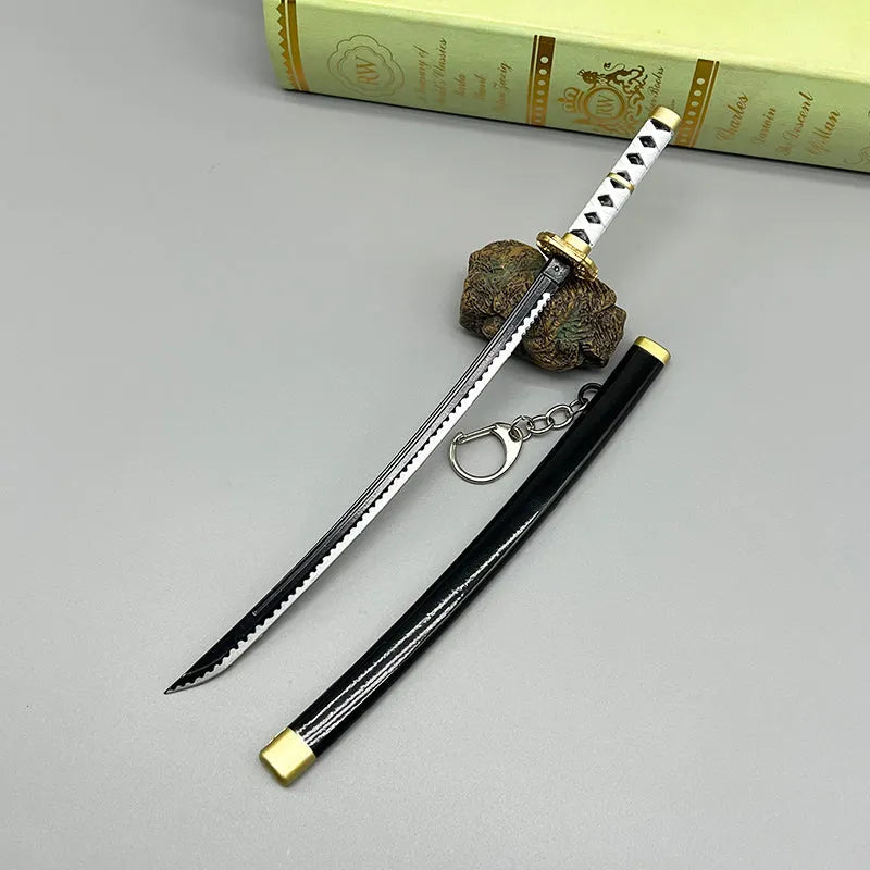 This 22cm, 1:6 scale Vergil Yamato model weighs 75g. It is made from durable zinc alloy. The blade displays a distinct, wavy temper line (hamon) pattern. This adds to its authenticity. The sleek black scabbard (saya) is included. It features matching gold-colored accents at its tip and mouth. This Devil May Cry model also has a small keychain ring. This is attached to the scabbard for an extra detail. It’s a stunning Devil May Cry weapon collectible.