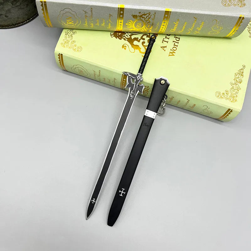 This 1:6 scale model measures 24cm and weighs 82g. It is made from durable zinc alloy. The meticulous craftsmanship captures the sleek, black design of this Sword Art Online weapon. Fans will appreciate the accurate details of the elucidator sword art online. This collectible is a tribute to Kirito's dual-wielding prowess.