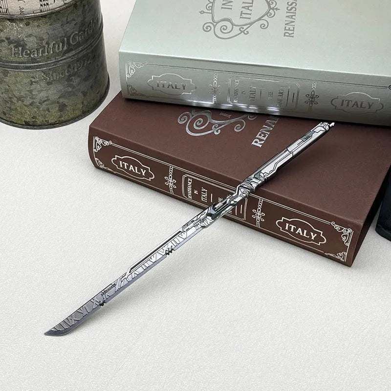 Unlike other blades, the Yama has a unique, high-tech aesthetic. The entire surface, from blade to hilt, is covered in intricate, circuitry-like etchings. The hilt is seamlessly integrated into the blade's design. It features subtle green accents that evoke its advanced origins. This Cyberpunk Sword truly looks like a piece of advanced machinery.