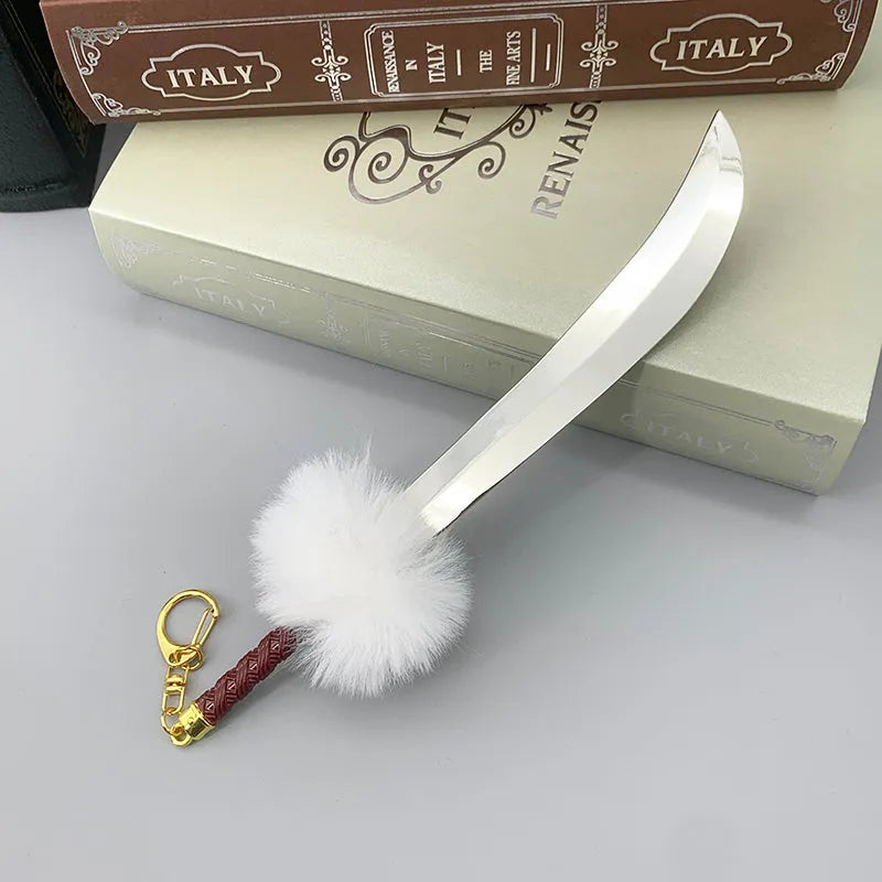 Known as the "Iron-Crushing Fang," the Tessaiga sword was forged from a fang of Inuyasha's powerful father. Our tessaiga replica captures the sword's most recognizable features. The most striking detail is the fluffy white fur guard. The handle has a reddish-brown, woven-textured grip. The brightly polished blade is curved, like a giant fang. This is a beautiful inuyasha tessaiga collectible.