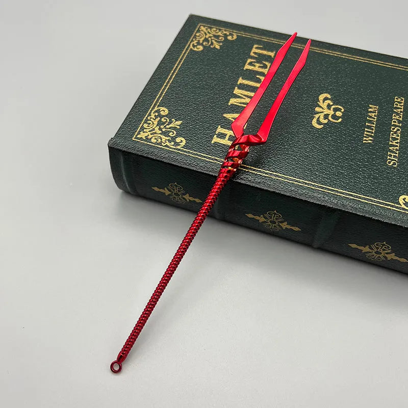 The Spear of Longinus is a powerful and mysterious object. It features a distinctive red, bident, double-helix design. In the NGE universe, it can penetrate A.T. Fields. It is often seen in pivotal, dramatic scenes. This evangelion Spear of Longinus replica captures its imposing form.