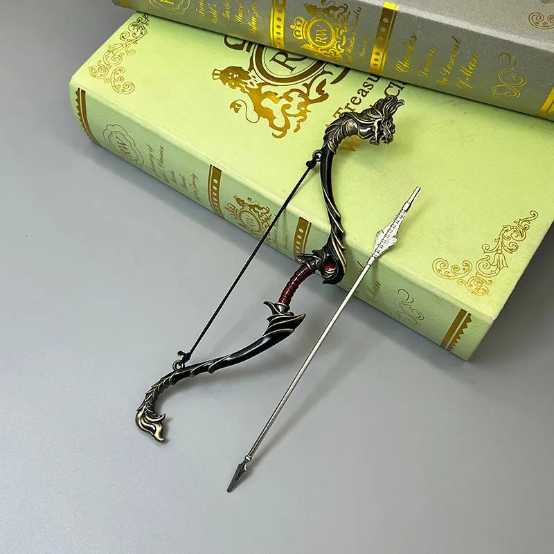 This bow is synonymous with the fearsome warrior, Lu Bu. Our replica captures its exquisite design. The bow features elegantly curved black limbs. These are accented with antique bronze-colored details. Ornate, sculpted beast or dragon heads adorn the bow's tips. The grip is wrapped in a striking red material. This offers a visual contrast and implies a comfortable hold. A detailed, separate silver-colored arrow is included. It features an intricately shaped spear-like arrowhead. This makes the Lu Bu weapon truly complete.
