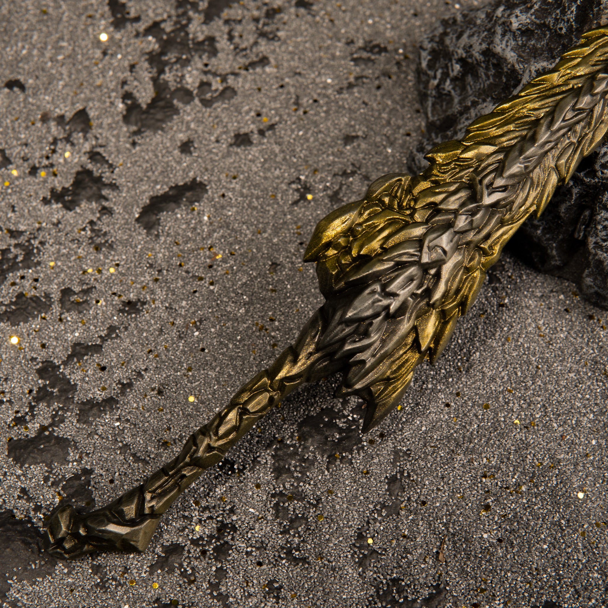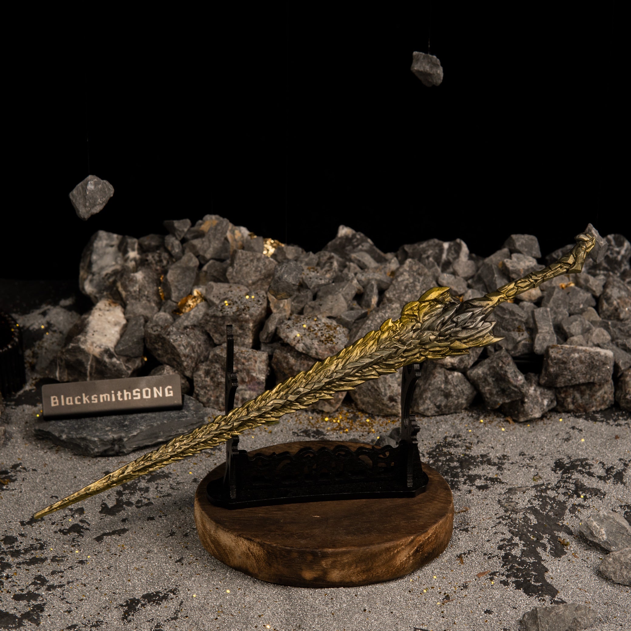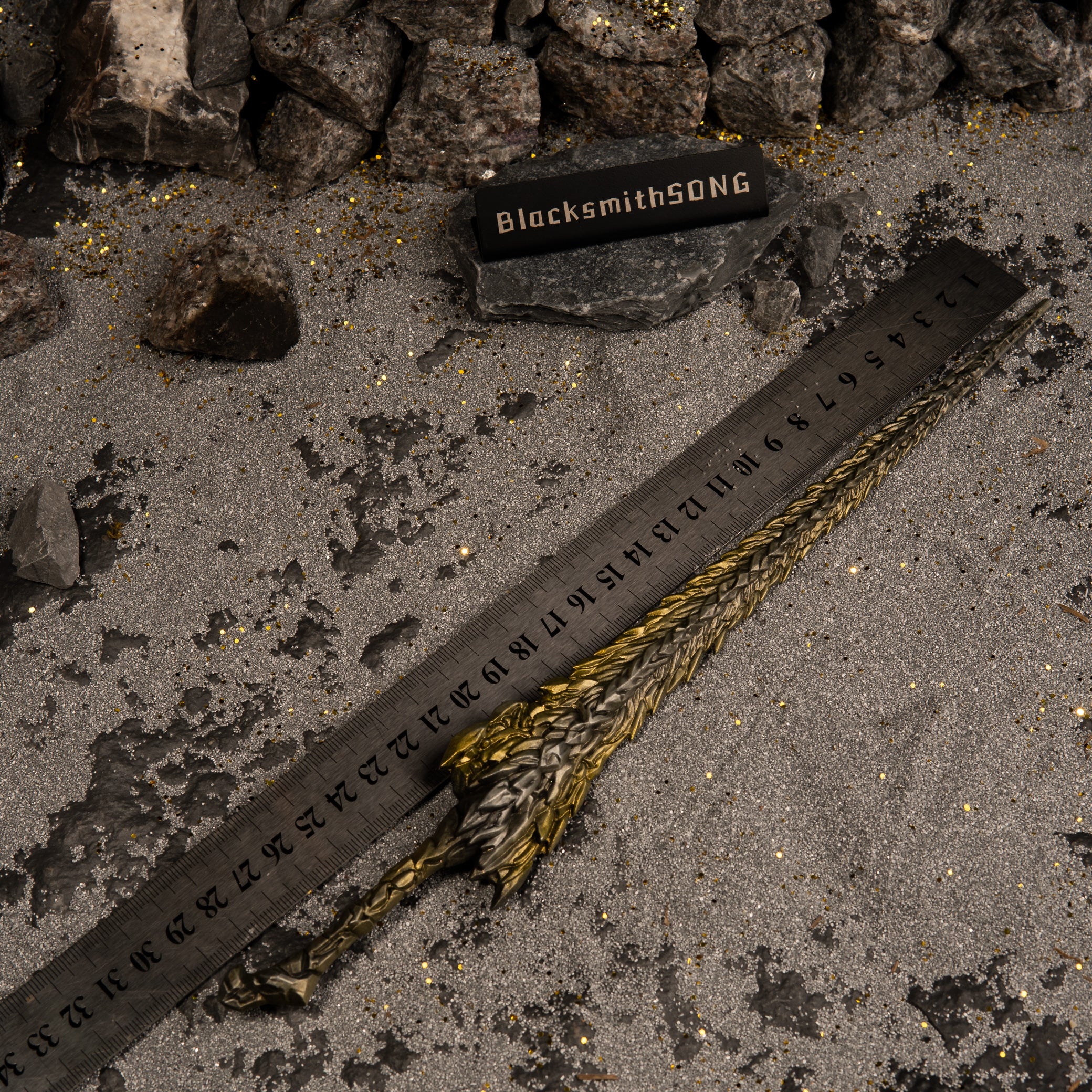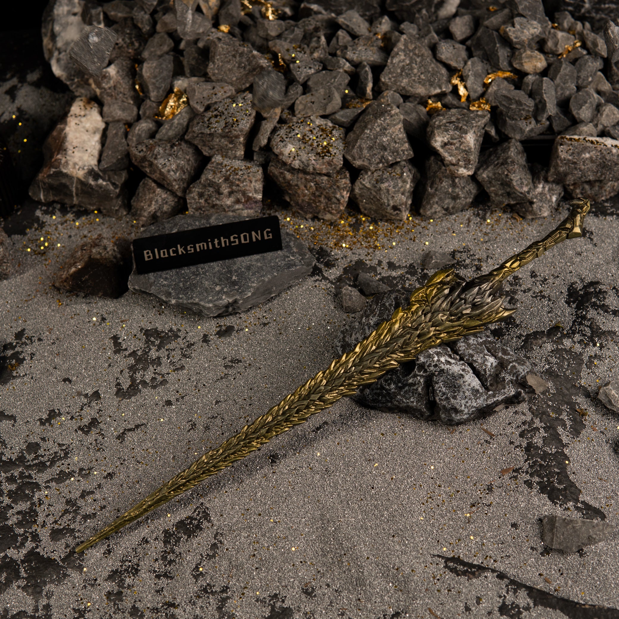 This replica captures the weapon's unique, organic texture. Your stunning photos showcase this incredible detail. The entire sword has a beautiful antique gold finish. Its form is made of countless braided and woven scales. This creates a powerful, draconic appearance. The hilt and blade flow together as one piece. This is a testament to our expert craftsmanship. A truly exceptional Placidusax sword.