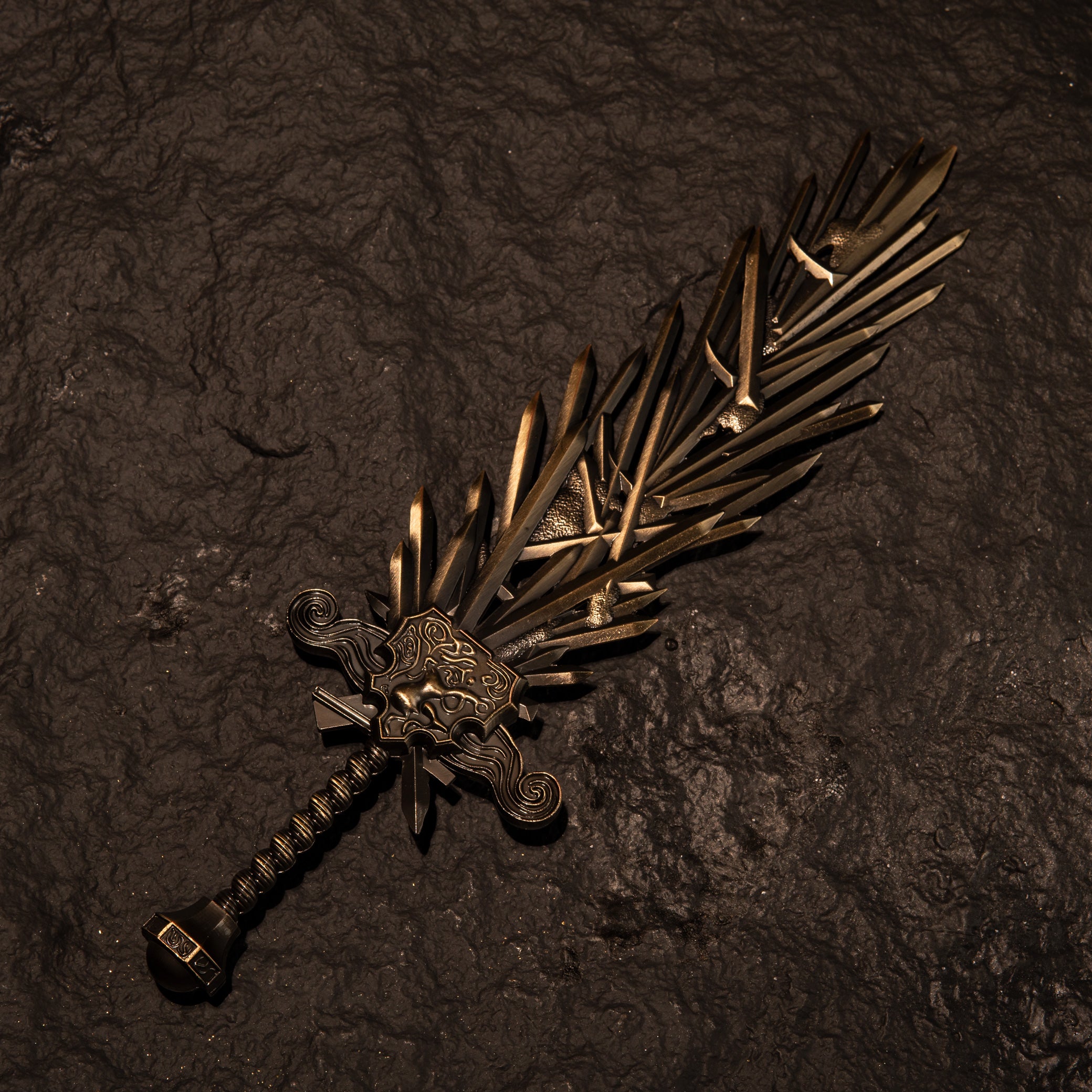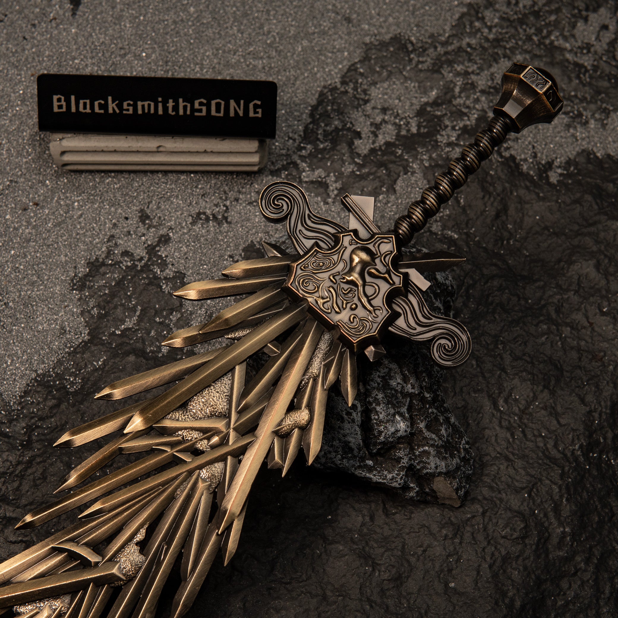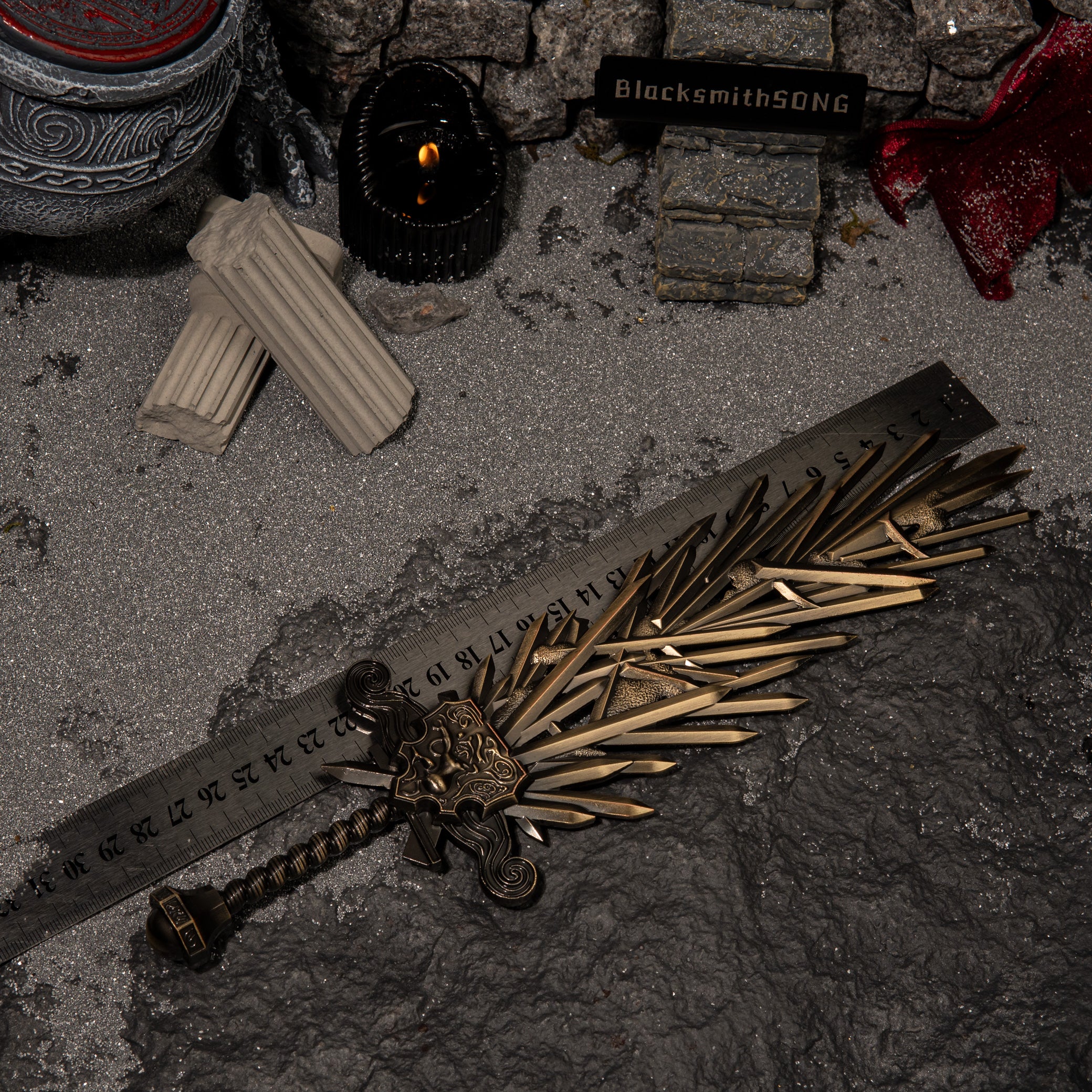 Our replica captures this chaotic design perfectly. Your stunning photos showcase its incredible detail. Dozens of tiny, individual blades form one greatsword. The entire piece has a rich, antique bronze finish. This gives it an ancient, storied appearance. The ornate guard features a proud beast emblem. This is a testament to our craftsmanship. Every detail is made to honor the original.