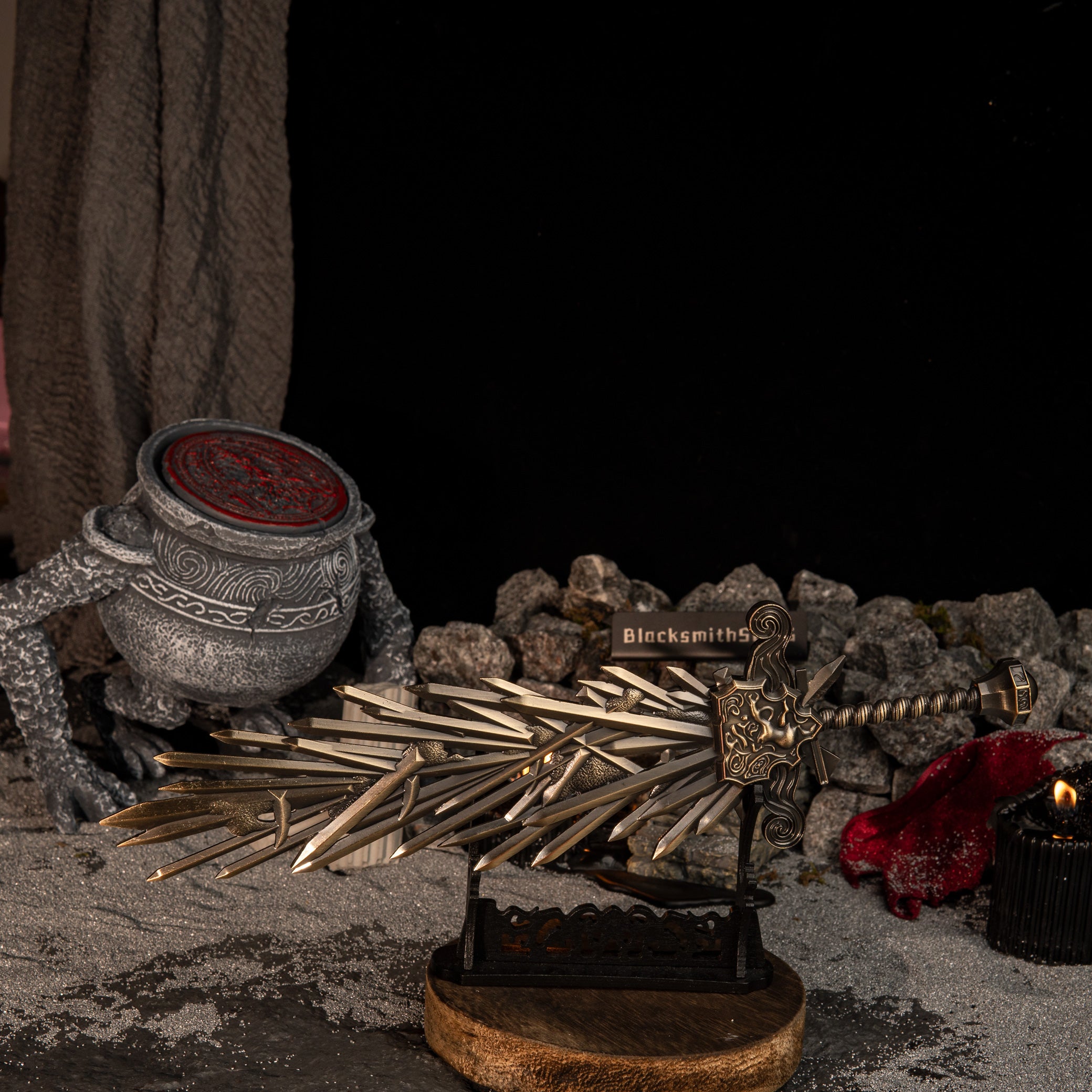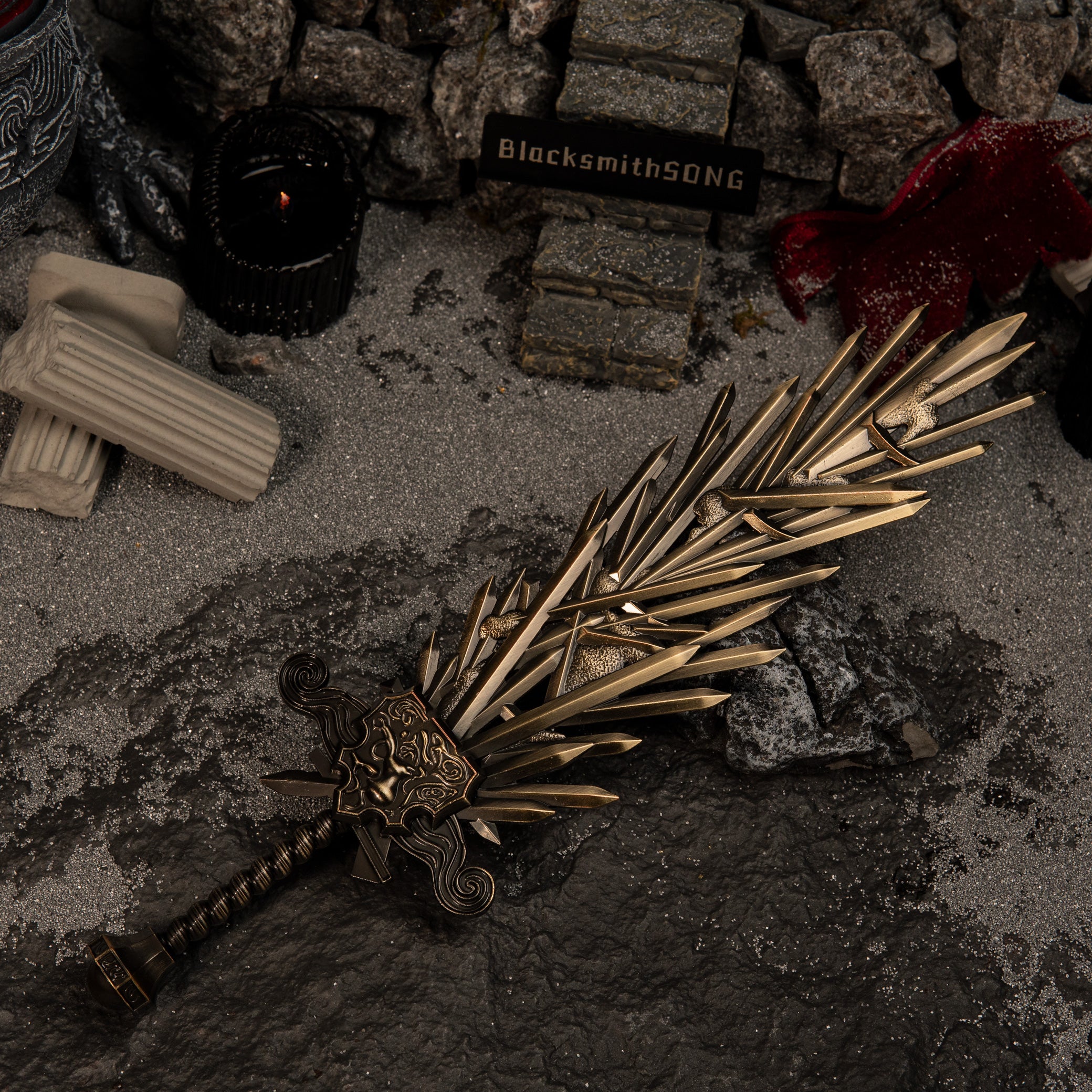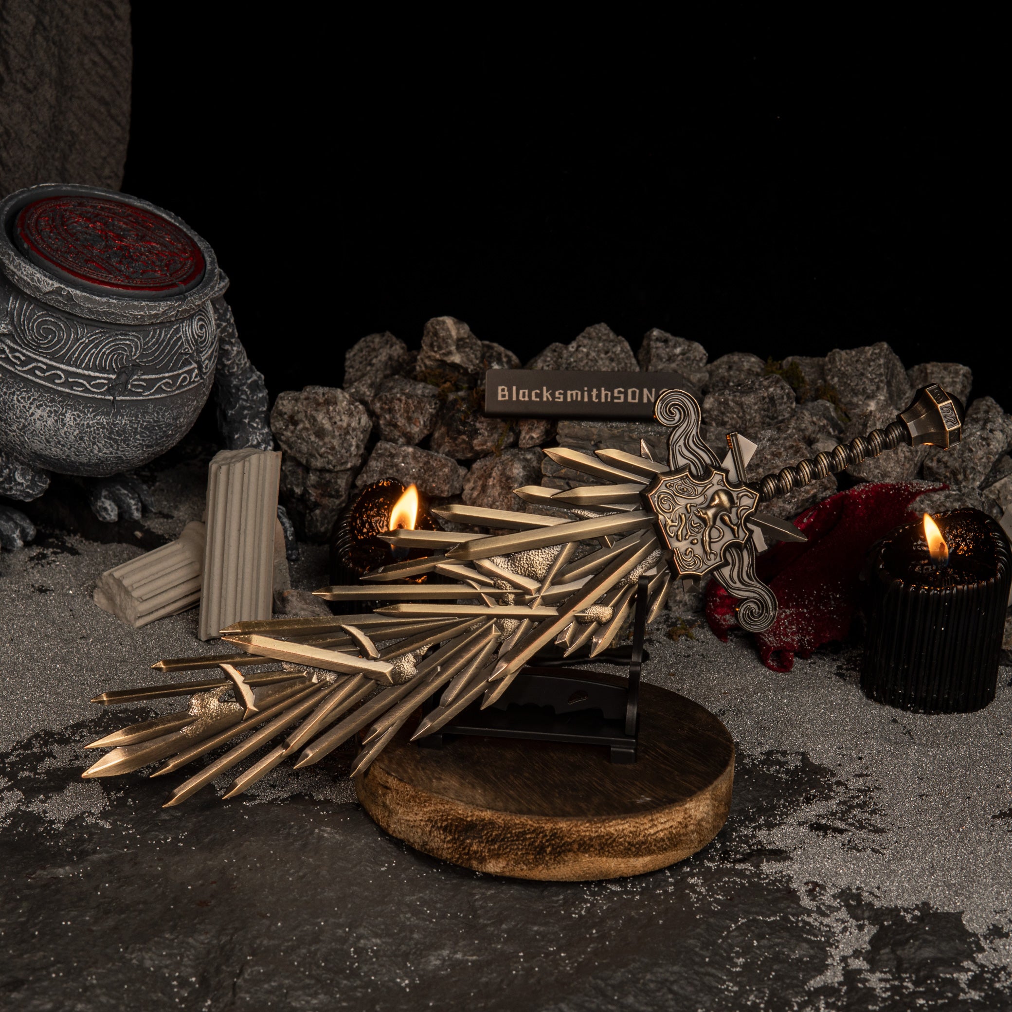 Our replica captures this chaotic design perfectly. Your stunning photos showcase its incredible detail. Dozens of tiny, individual blades form one greatsword. The entire piece has a rich, antique bronze finish. This gives it an ancient, storied appearance. The ornate guard features a proud beast emblem. This is a testament to our craftsmanship. Every detail is made to honor the original.