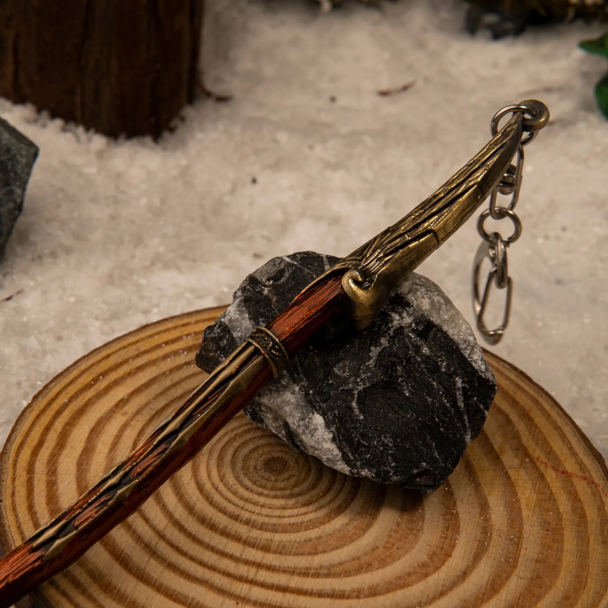 The Golden Grip: Notice the crisscross golden patterns on the handle? That represents the high-level upgrades (like the "Grip of the Maze" or "Valkyrie Handle"). It contrasts beautifully with the dark wood grain texture.