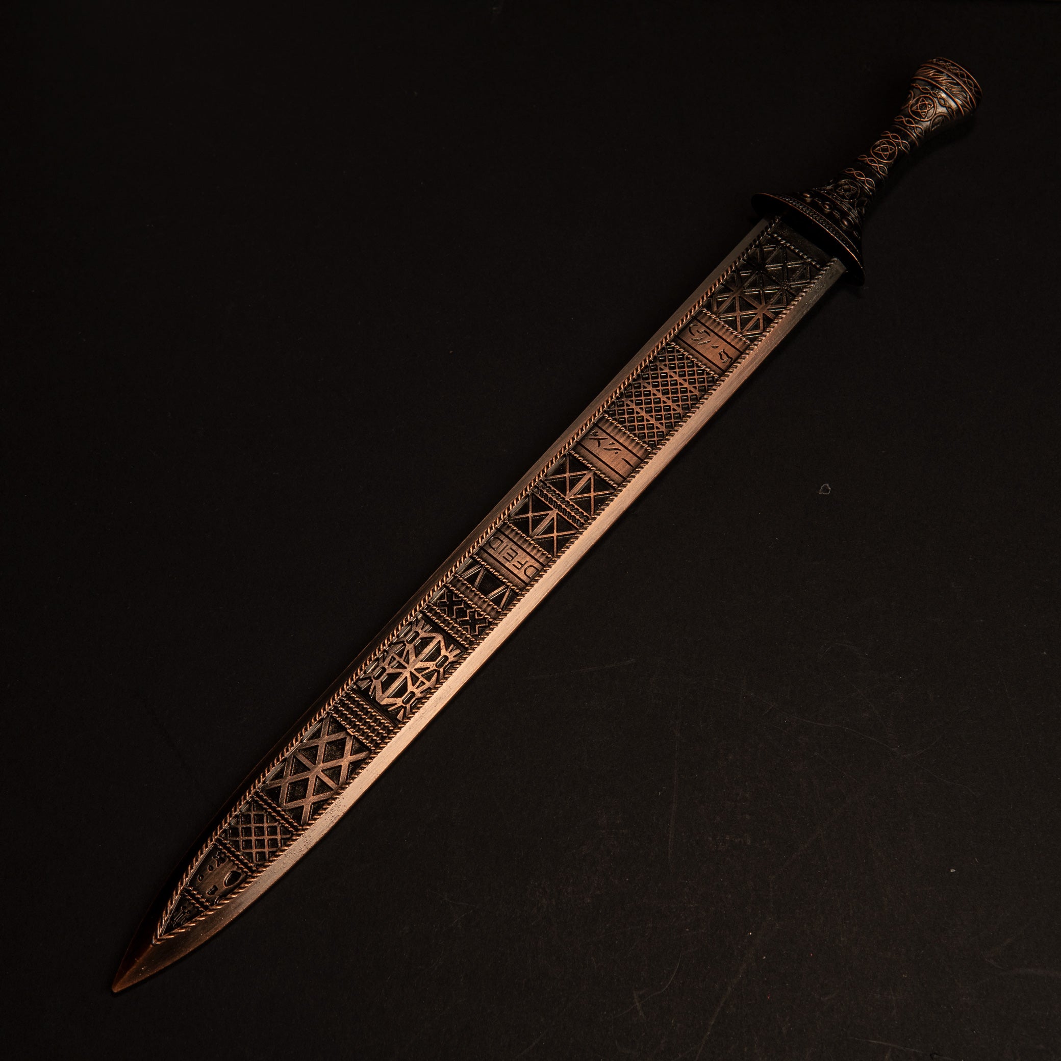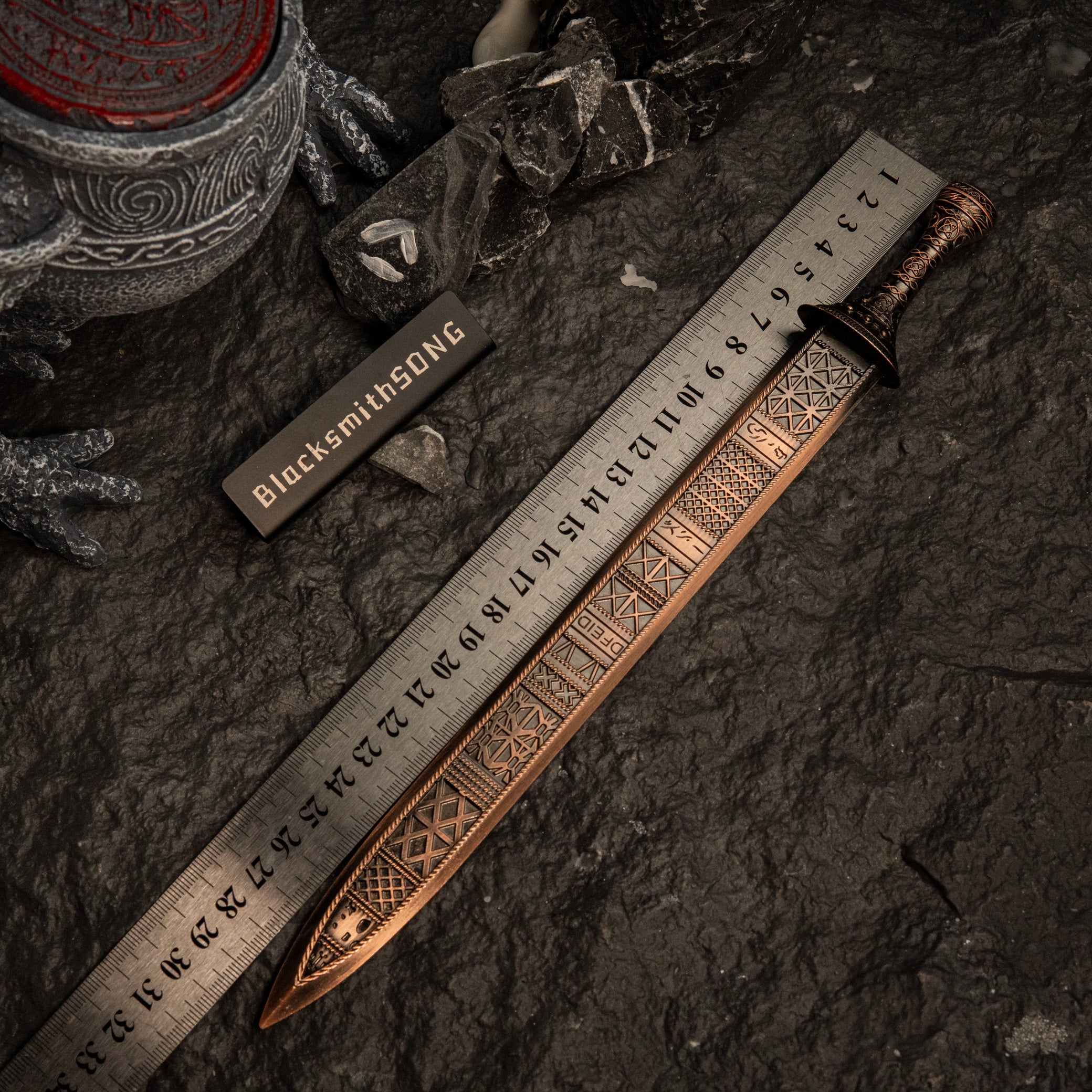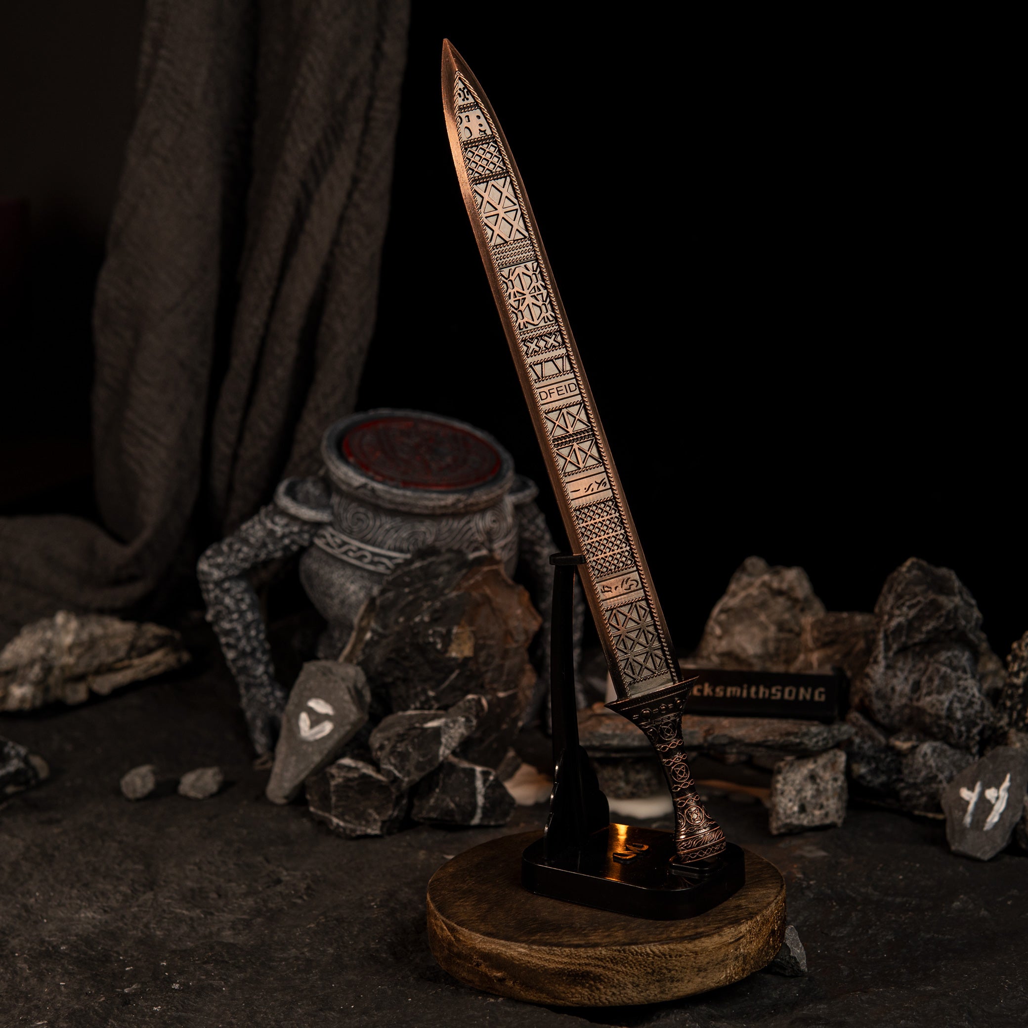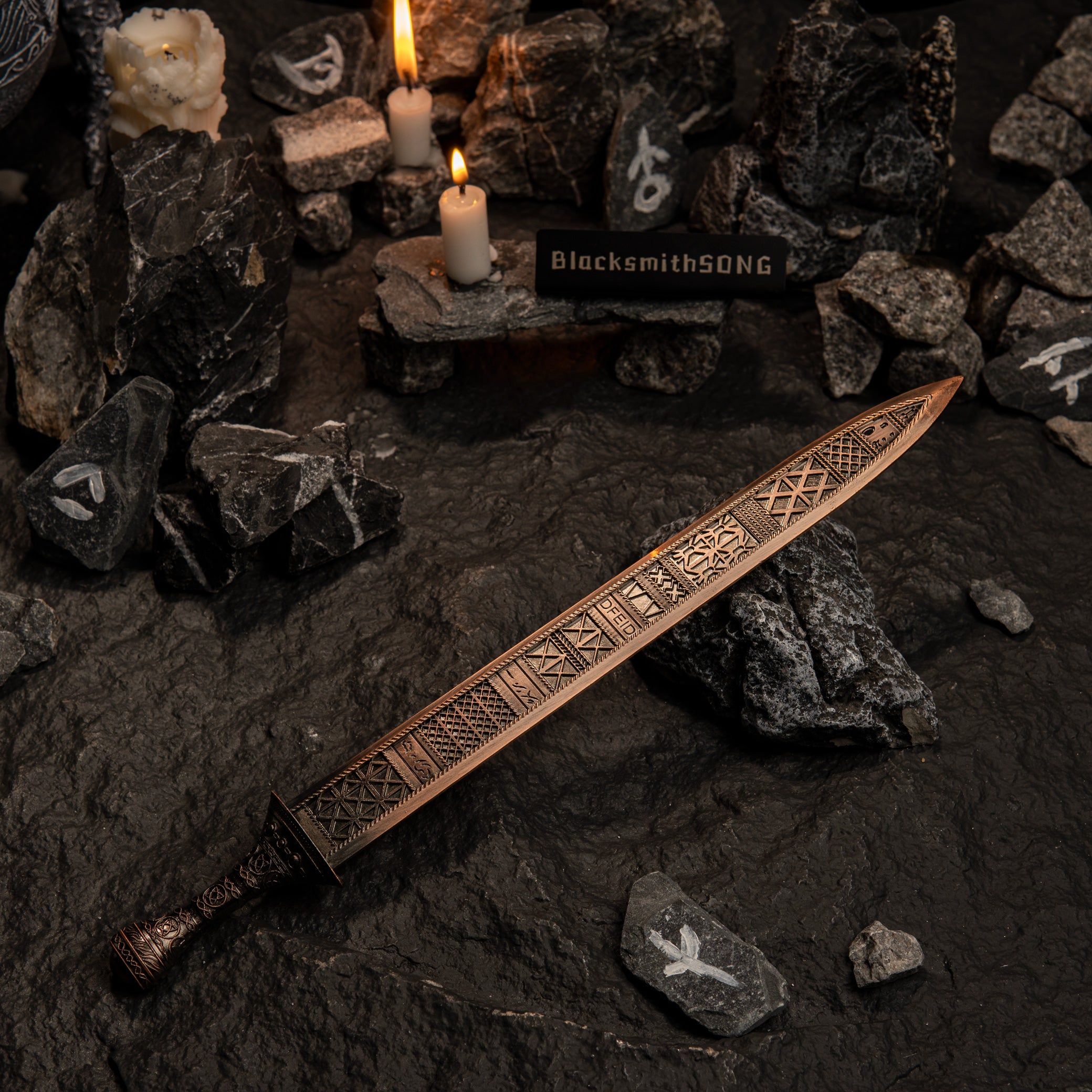 Our replica is a monument to intricate detail. Your stunning photos showcase its ancient beauty. The entire sword has a rich, antique bronze finish. Its broad blade is covered in detailed engravings. These patterns are both geometric and runic. They tell the silent story of a forgotten people. The simple hilt and ornate pommel are also detailed. This is an exceptional runic sword replica.