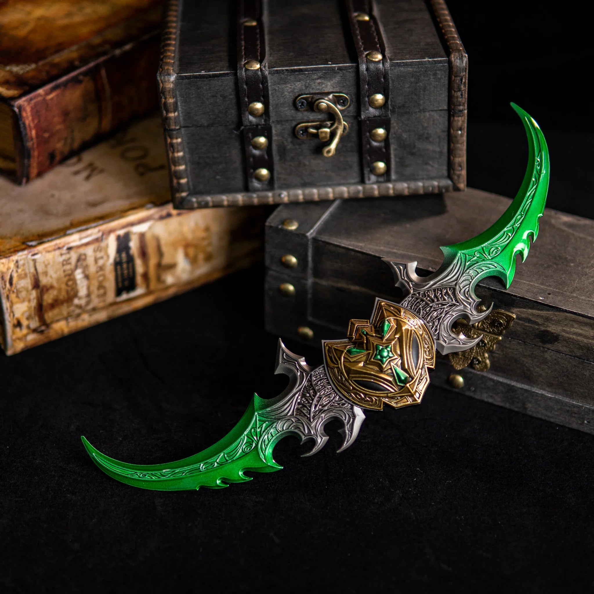 These are the famed twin blades of azzinoth. This replica perfectly captures their demonic elegance. Gleaming, translucent fel-green blades curve from an ornate center. Intricate silver-colored metalwork evokes elven and demonic craftsmanship. The central hand-shield is gold and black. It features a striking green gem at its core. This is a faithful model of the illidan stormrage warglaives.